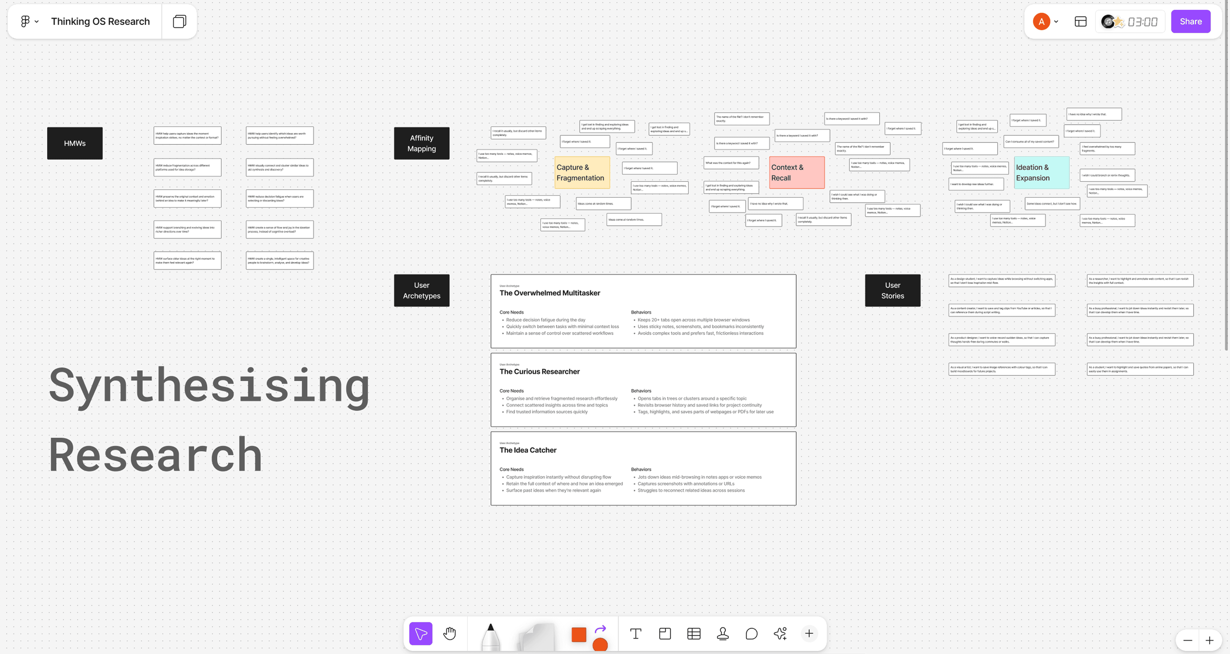 After mapping behaviours across archetypes, I synthesised and theme coded core tensions in how people capture, connect and rediscover ideas and concepts. These became the key insights and How Might We statements that guided my design decisions.